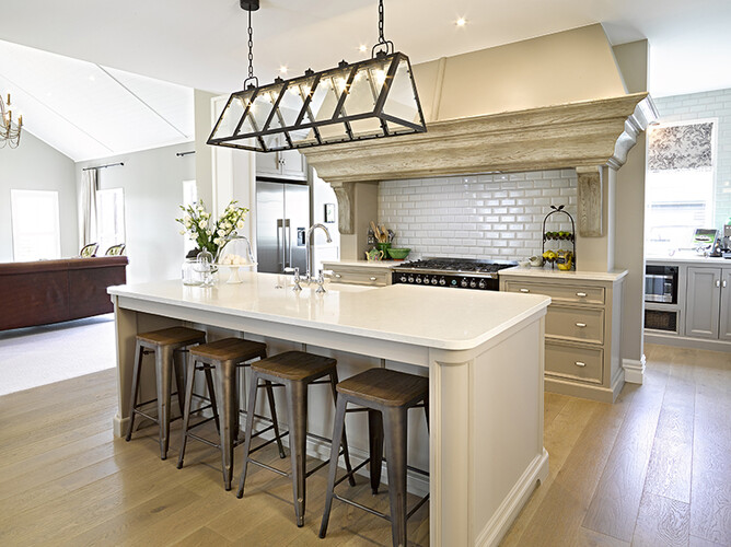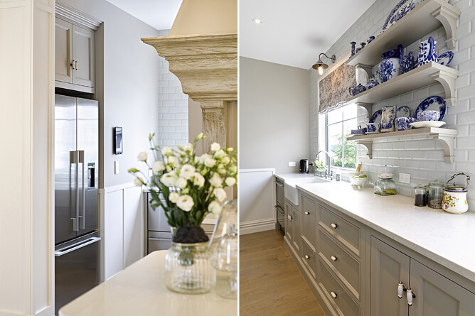 This beautiful kitchen encapsulates farmhouse elegance with a rustic timber finish to compliment the oversized range hood and quant scullery.