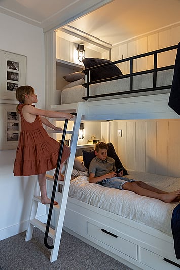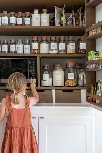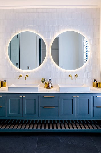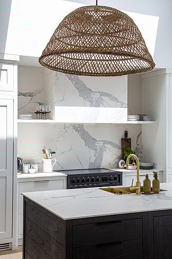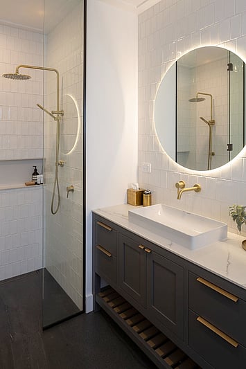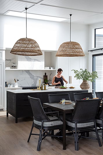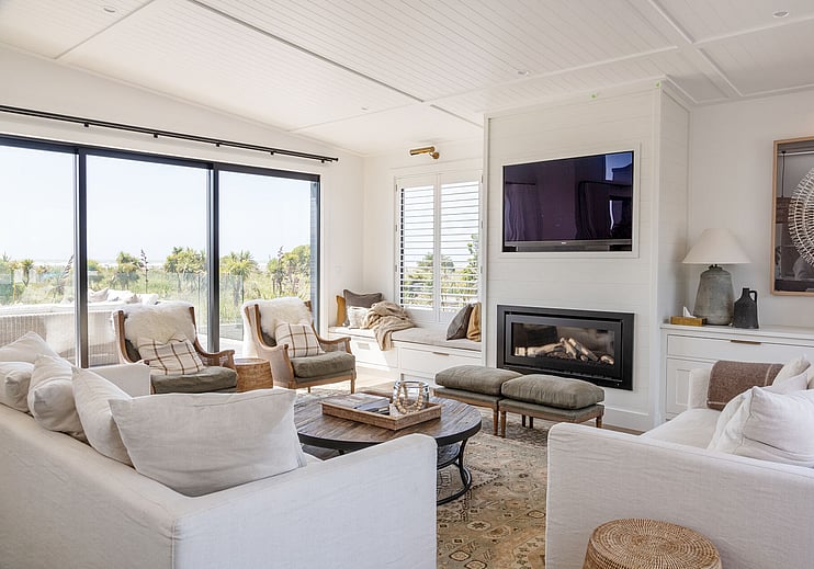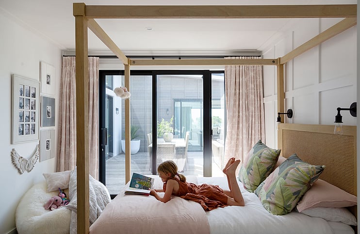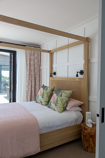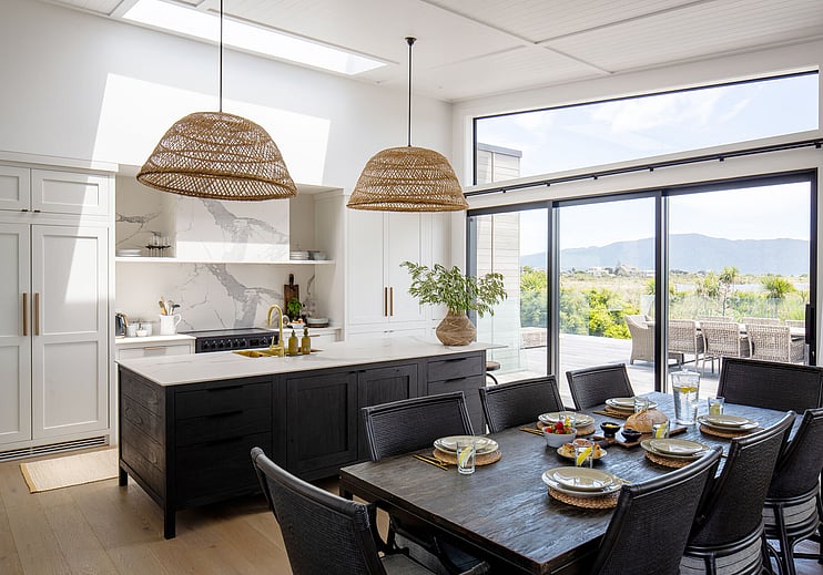 The Taranui Beach House showcases our shaker kitchen, vanities, fitted cabinets, beds, and feature doors, custom made by The Gourmet Kitchen Company.